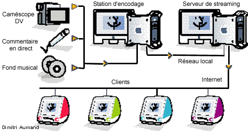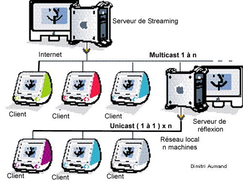 Lors d'une transmission en direct en multicast, les données capturées sont numérisées (si l'on est muni d'un équipement analogique) ou simplement transférées (c'est le cas du DV, notamment) sur un ordinateur avec un logiciel d'encodage. C'est le rôle de la machine de diffusion (improprement appelée broadcaster), qui ne diffuse en fait qu'un seul flux vers un serveur de streaming. C'est depuis ce dernier que QuickTime Streaming Server ou un logiciel serveur équivalent (voir encadré) envoie le flux encodé, reçu par l'intermédiaire du réseau local. Si le contenu vidéo est inclus dans une page Web,l'intégration doit être configurée à ce niveau. Dans le cas contraire, on accède à la vidéo en se connectant directement depuis le lecteur QuickTime. Le flux est ensuite transmis soit vers un MBone (Multicast Backbone), sur lequel les clients peuvent se brancher directement à l'aide d'un fichier SDP, soit vers un serveur de réflexion, qui relaie ce flux si nécessaire. On emploie généralement ce type de serveur pour contourner un firewall ou un réseau à configuration particulière, au lieu de recourir à l'encapsulation d'un flux RTP dans des trames HTTP.