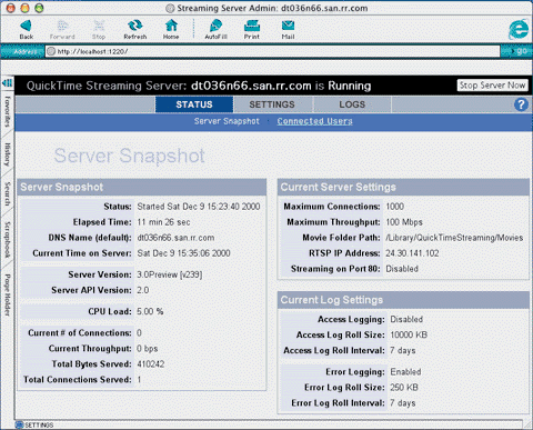 La page Web de configuration de QuickTime Streaming Server. Le paramètrage se fait par l'intermédiaire d'une page Web (sur le port 1220 de la machine Localhost). Cette façon d'opérer le rend à la fois simple, facile à mettre à jour et portable.